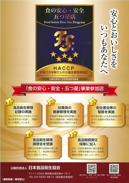 この度、公益社団法人日本食品衛生協会による「食の安心・安全・五つ星事業」において、2025年度も無事に継続判定をいただきました。